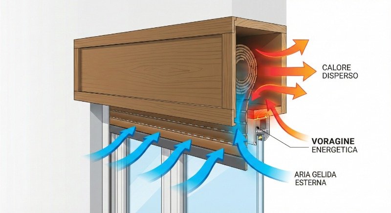 L’aria che penetra nel cassonetto non si ferma lì. Trovando fessure nel celino di chiusura, entra negli ambienti domestici sotto forma di spifferi. Questi movimenti d’aria convettivi abbassano drasticamente la temperatura percepita nella stanza, costringendo ad alzare il termostato per compensare la sensazione di freddo.