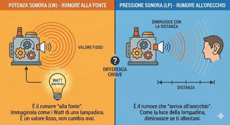 - Potenza sonora (Lw): È il rumore “alla fonte”. Immaginala come i Watt di una lampadina. È un valore fisso, non cambia mai, indipendentemente da dove metti la macchina. È questo il valore che devi guardare per confrontare due modelli.