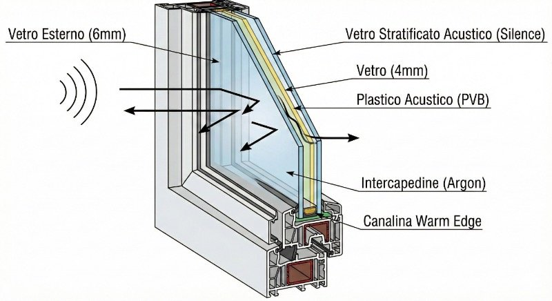 - Risultato: Abbattimento di 45-46 dB. Questa configurazione “uccide” il rumore molto meglio di un triplo vetro standard e costa spesso uguale. Se il tuo problema è il traffico, non spendere soldi per la terza lastra, spendili per il plastico PVB acustico.