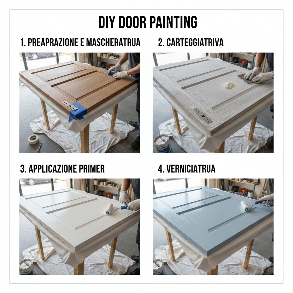 - Preparazione e Mascheratura: Smonta la porta o usa nastro carta per schermare maniglie e cerniere. Stendi teli per proteggere il pavimento.